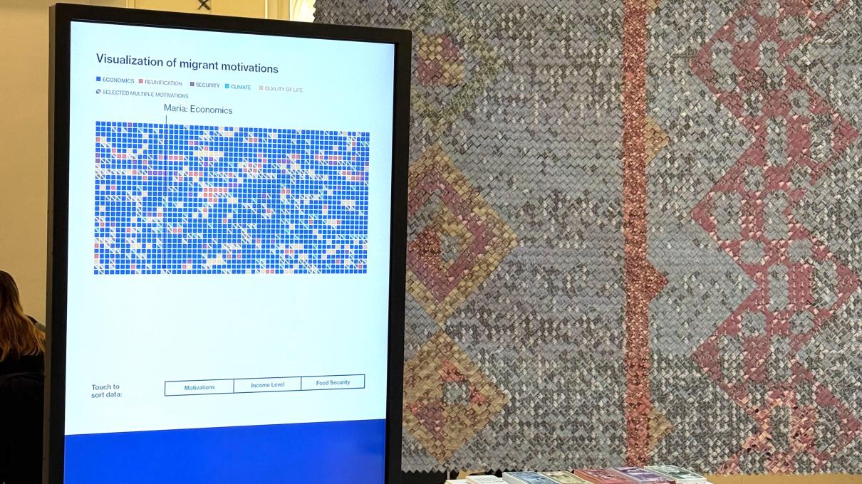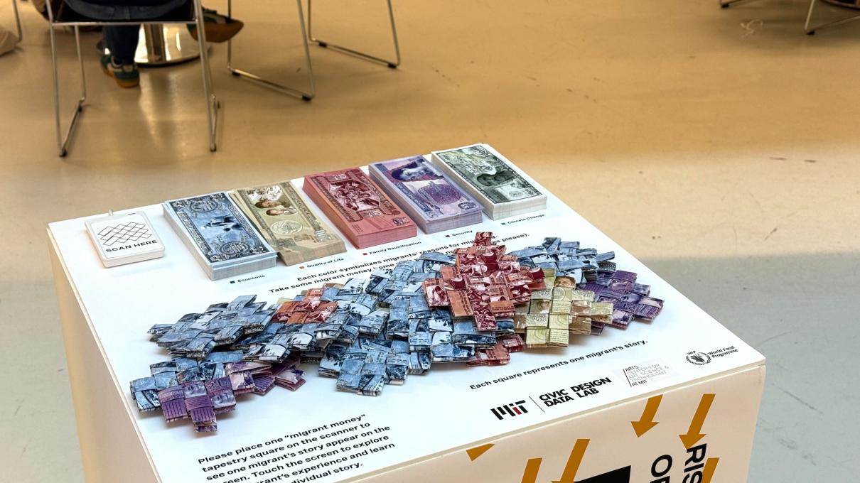 Distance Unknown is a tapestry woven from paper currency as a physical data visualization of the financial sacrifices that Central American migrants make to journey to the United States. Based on data collected with the United Nations World Food Programme and the Migration Policy Institute, the project documents data from nearly 5,000 households in El Salvador, Guatemala, and Honduras as well as more than 2,000 migrants at border locations about the factors contributing to migration. Additionally, an interactive map allows visitors to explore migrant journeys and the barriers they face along the way.