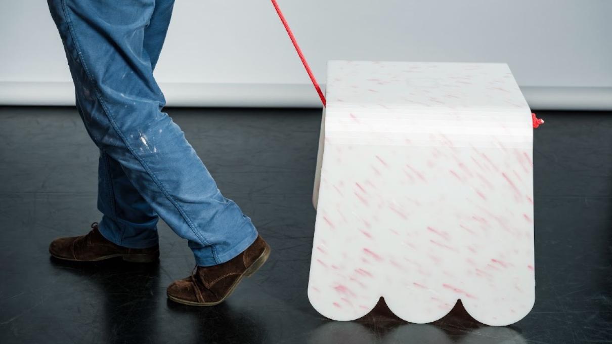 Five individuals seated and surrounding small benches made of white and pink recycled material and with pink ropes attached.